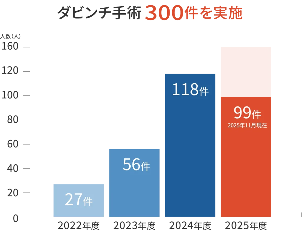 高度かつ低侵襲な治療を地域の皆さまに提供するため、当院では2022年に最新鋭の手術支援ロボット「ダビンチ」を導入しました。以来、多くの患者さんがこの手術を受けられ、安心して治療に臨んでいただいております。