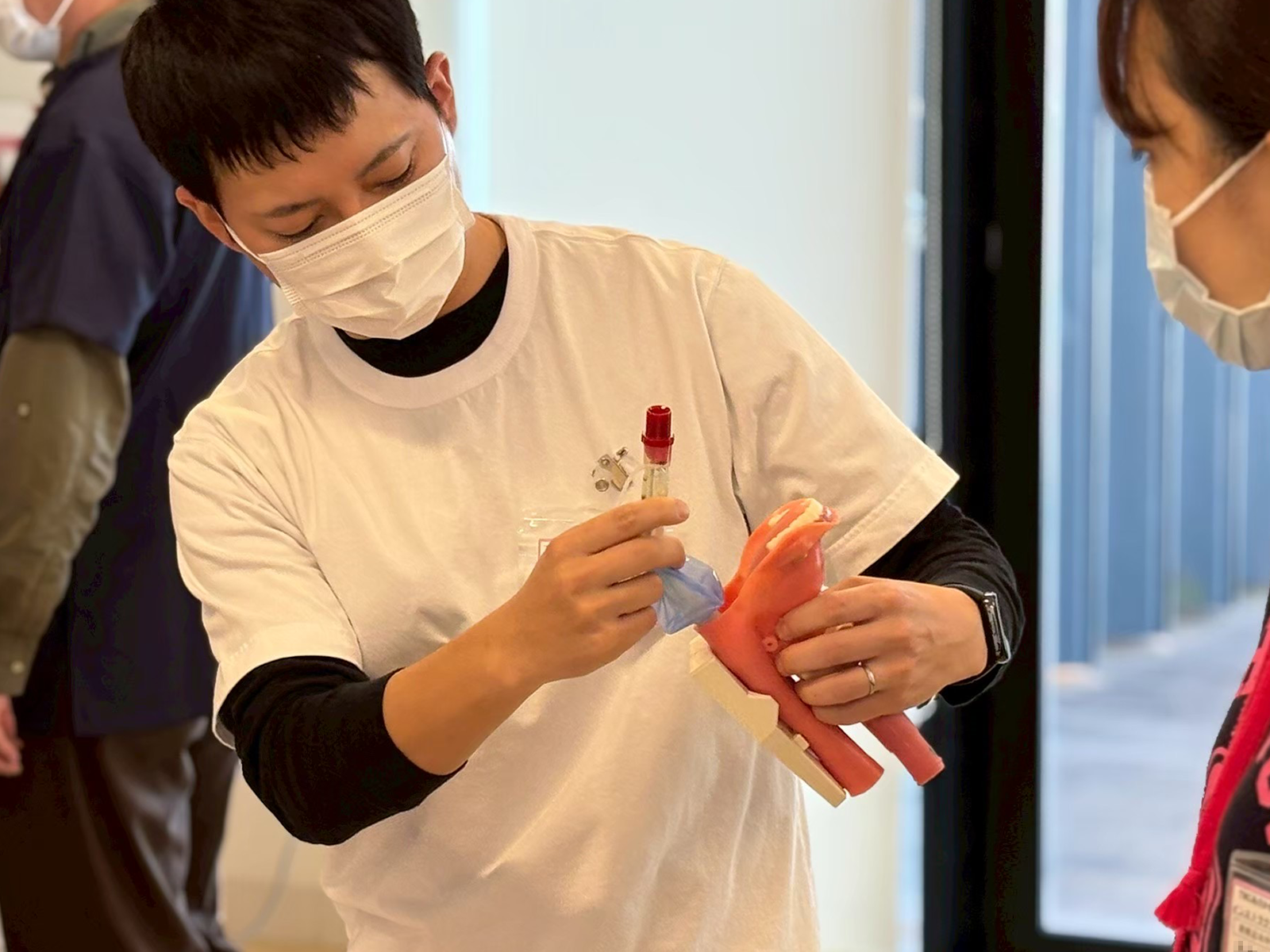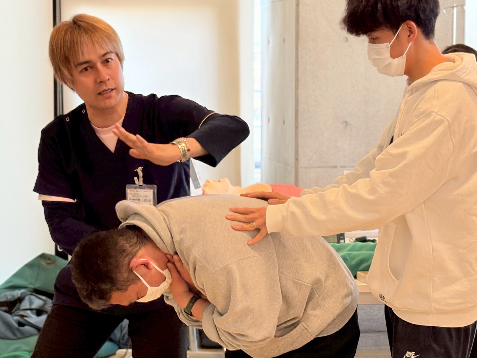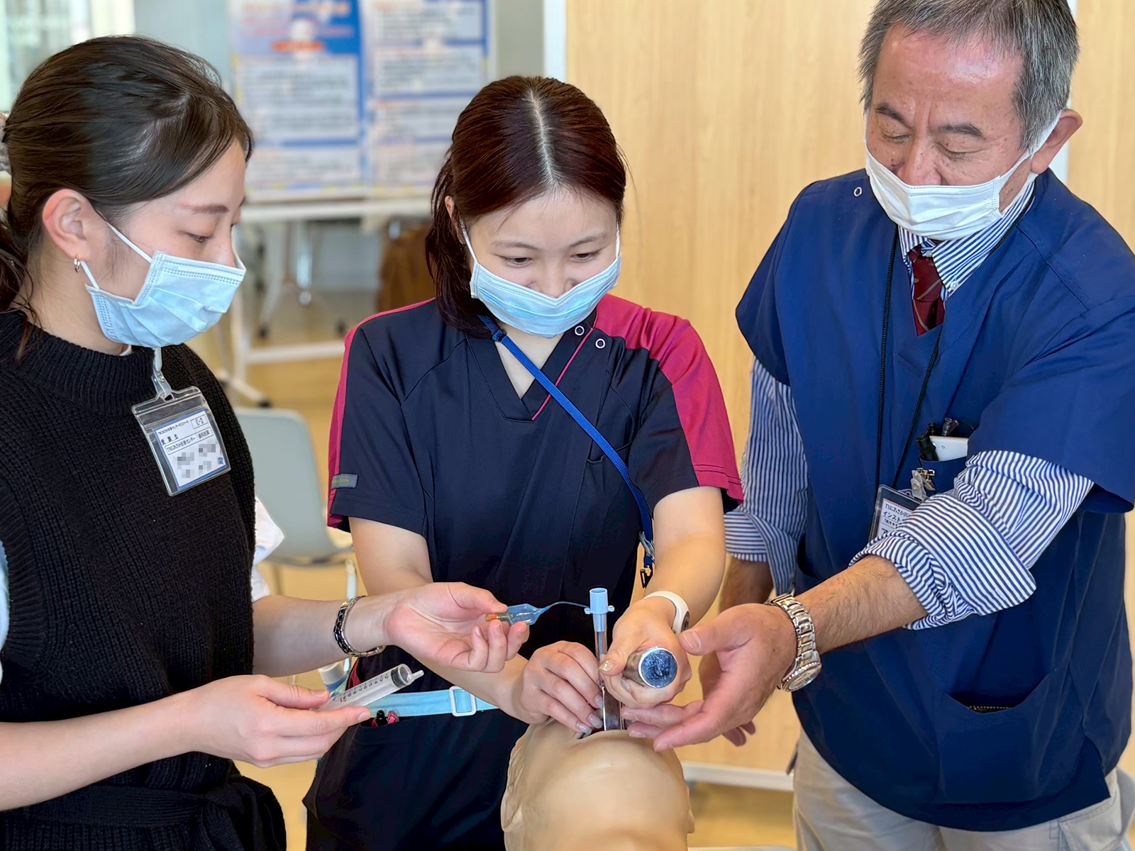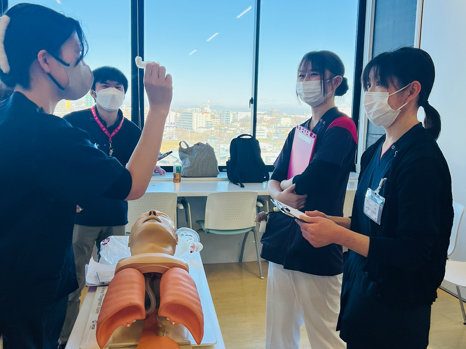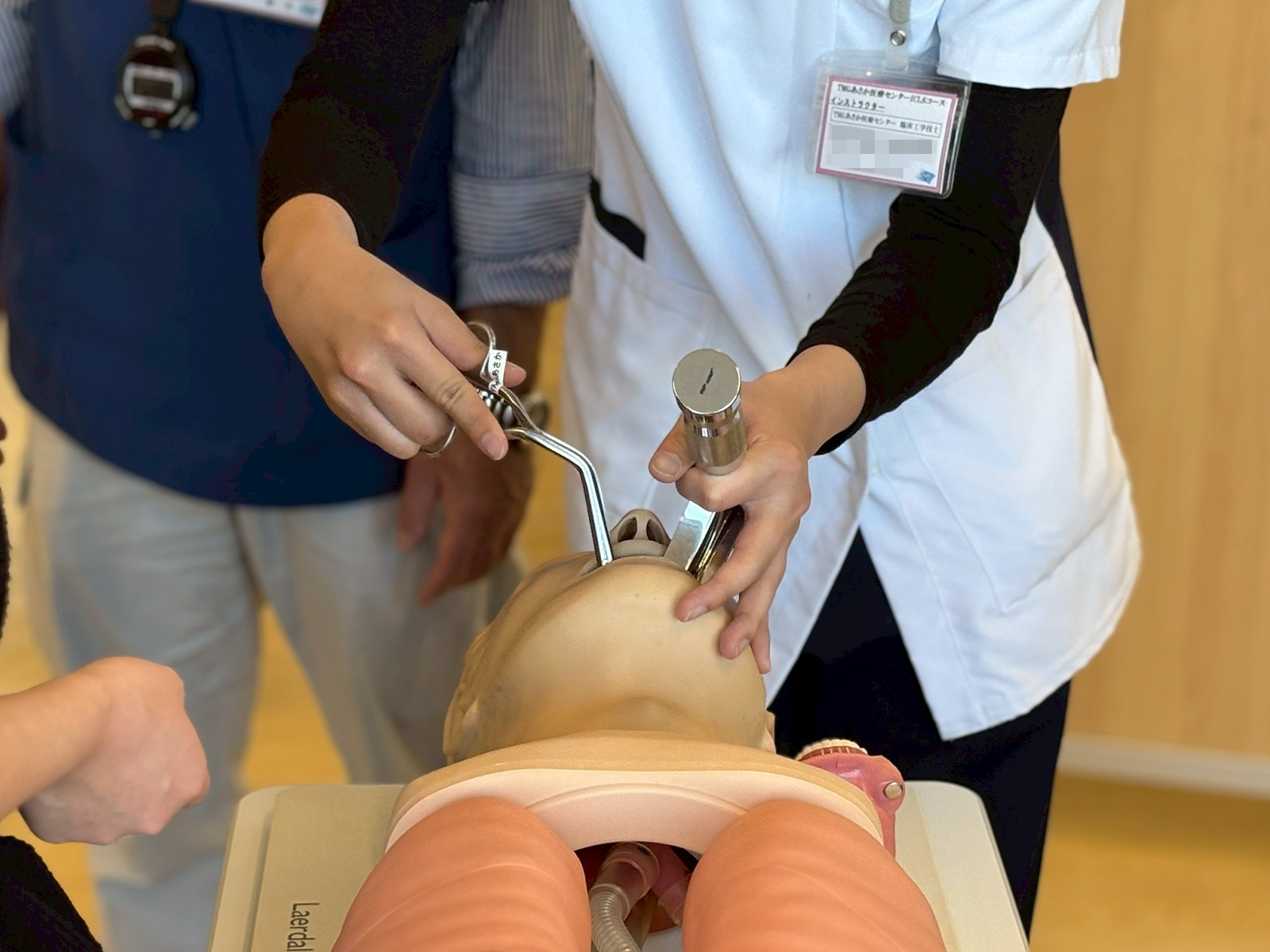さらに、医師が実施する気管挿管についても、トレーナーを用いて一連の流れを体験します。