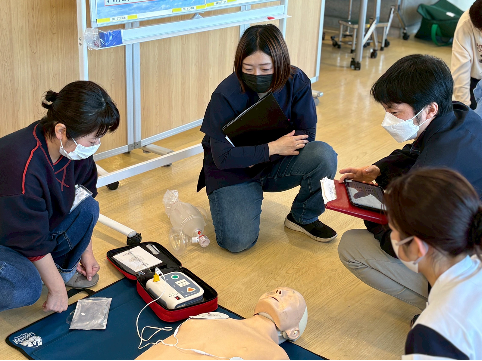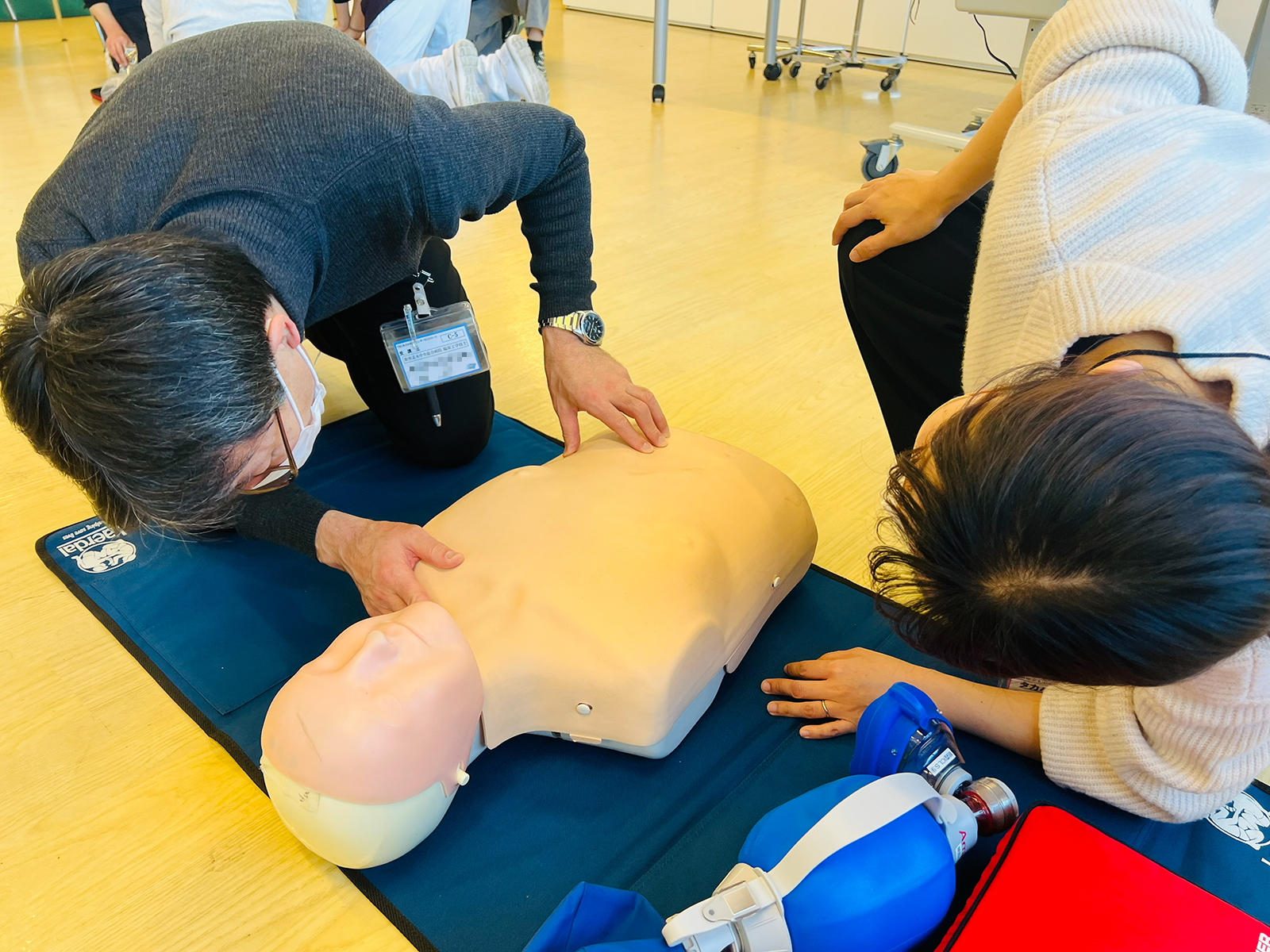 人形を使用して胸骨圧迫のトレーニングをします。