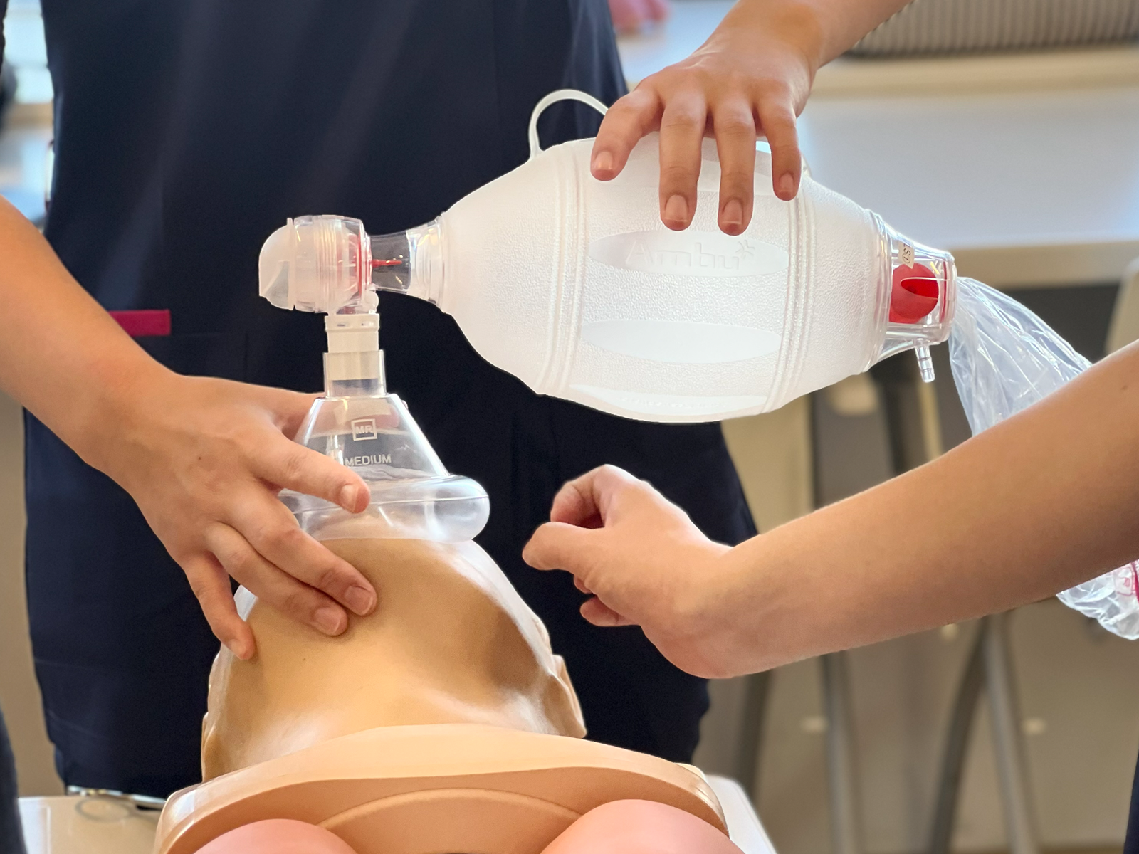 バッグバルブマスク換気、各種声門上気道デバイスなど複数の気道確保デバイスを用いた手技を習得します。